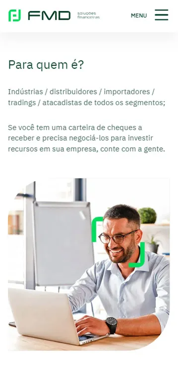 Portando um leque de soluções, que englobam desde antecipação de recebíveis a concessão de crédito, a FMD tem como seu principal propósito confortar pequenas e médias empresas com suas soluções financeiras, de forma ágil e eliminando burocracias desnecessárias, almejando sempre maior fôlego para o crescimento desses negócios.
